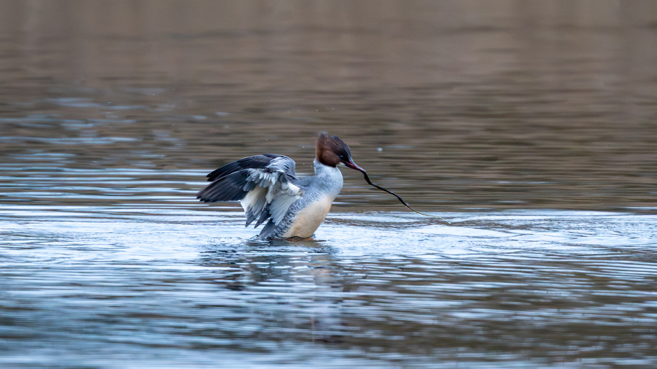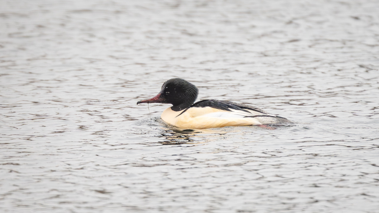 Seltene Gäste im NSG Tibaum. Am 13. und 14. Februar 2026 suchten 4 Gänsesäger (2 m., 2 w.) im östlichen Bereich ausdauernd nach Nahrung (H. Backhove, J. Hundorf).